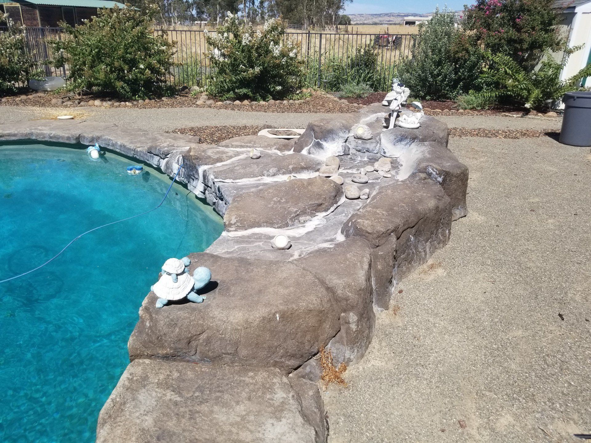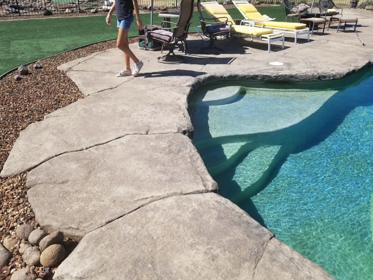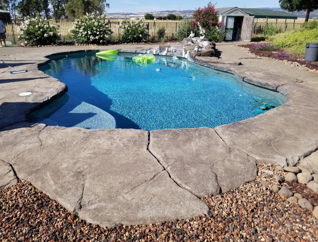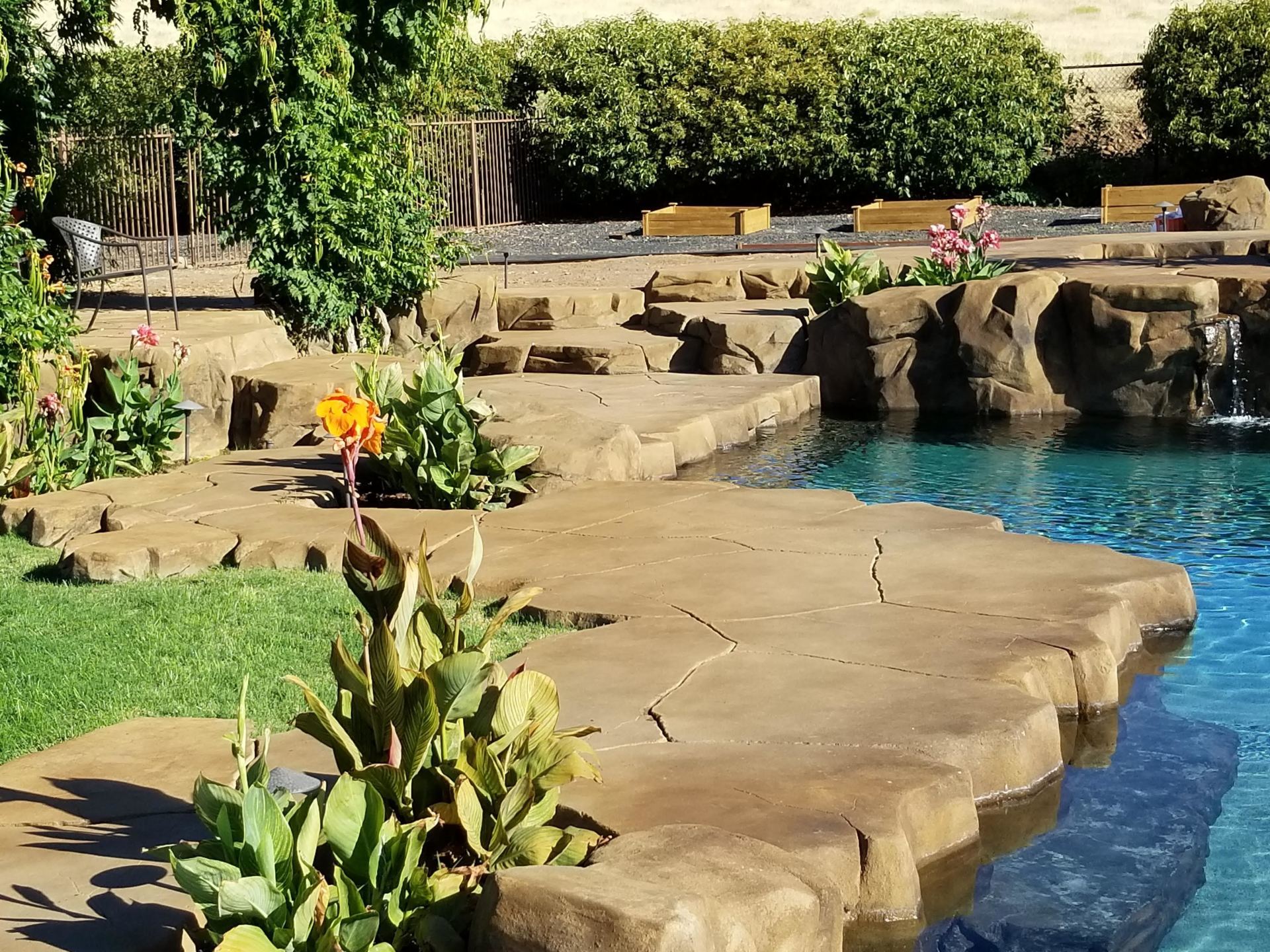 This pool's original stain was faded and calcium was abundant around the pool, spa and waterfall features. We blasted the pool and rock features as well as some of the decking. All were resealed with proper concrete mixture and stained to home owners and specifications.